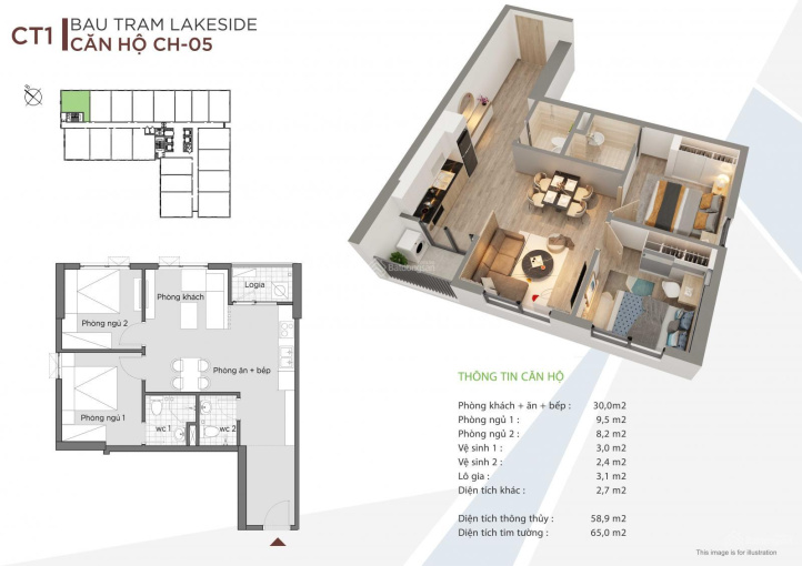 - Phòng khách + ăn + bếp: 30m2, ngủ 1: 9,5m2; Ngủ 2: 8,2m2; wc 1: 3m2, wc 2: 2,4m2; Lô gia: 3,1m2.