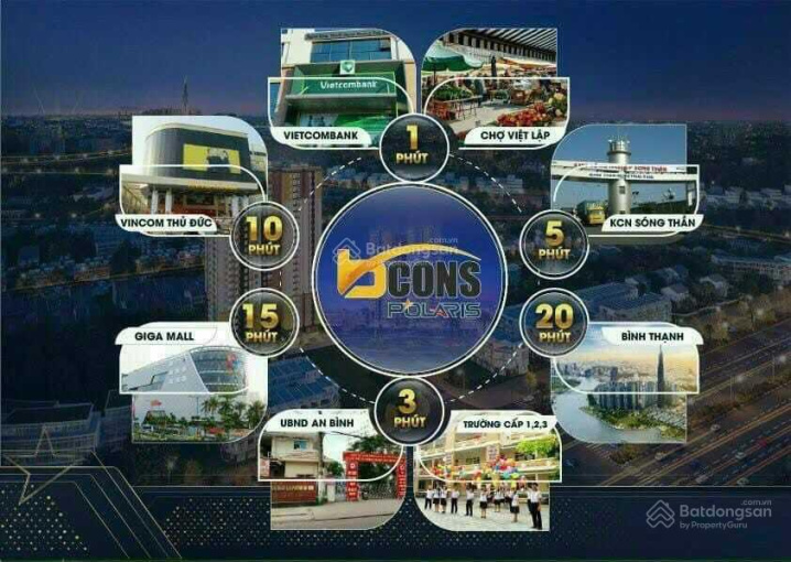 Kết nối của Bcons Polaris: 1 phút đến chợ Việt Lập, 1 phút đến trường học cấp 1 - 2 - 3, 5 phút đến KCN Sóng Thần, 10 phút đến Vincom Thủ Đức - Gigamall, 20ph đến sân bay TSN và trung tâm Q. 1 Q. 3...