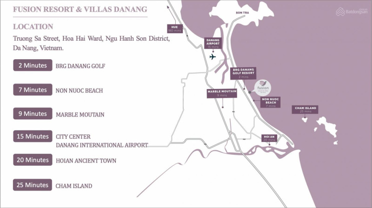 - Vị trí cách trung tâm thành phố 15km, phố cổ Hội An 15km, và sân bay Quốc tế chỉ với 20 phút đi xe.