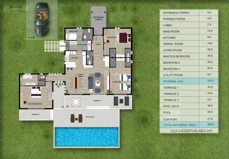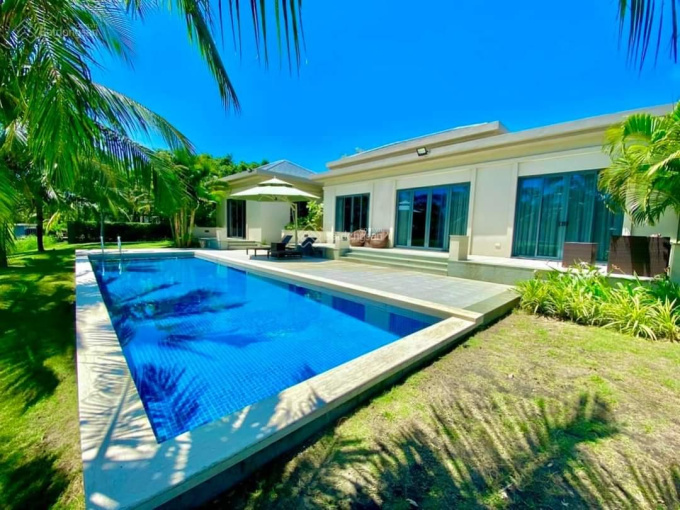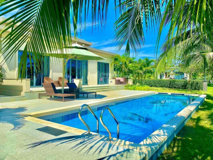 Giá trên bao gồm cả đất và biệt thự có 4PN, 4 toilet, có hồ bơi riêng ngoài trời 4x12m. Xe hơi chạy vào được tận nhà.
