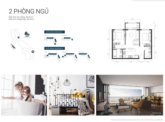 - 2 phòng ngủ 65m2, bàn giao toilet và sàn gỗ, đèn.