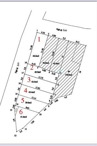 - Lô số 6 hướng tây bắc,ngõ rộng 4m, mặt tiền 3,5m x 11m = 39m2 giá 75tr/m2 (đất thực tế 45m2)