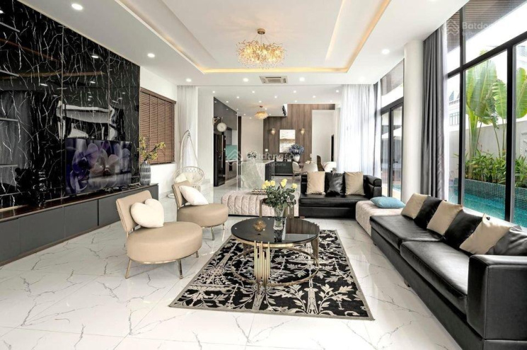 - Phòng khách rộng nối liền khu bếp và hồ bơi.