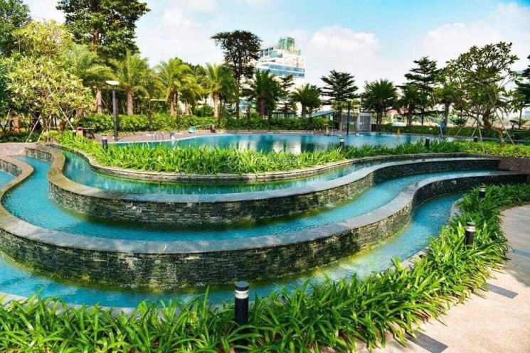 Hồ bơi ngoài trời và công viên cây xanh ở các cụm chung cư.