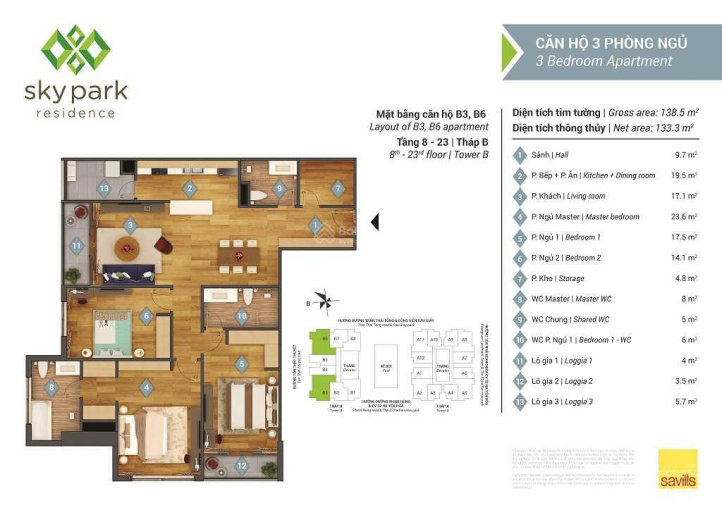 Hiện tại em đang có căn chung cư 133m2, 3 ngủ, 3WC, 2 phòng ngủ master, 2 ban công, 1 lô ra, bếp, nội thất cơ bản CĐT.
