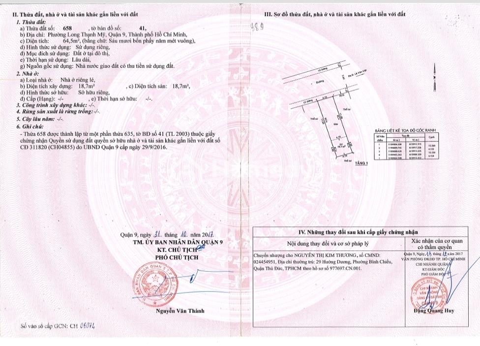 Cần bán nhà 1 trệt 2 lầu hẻm 568 đường Lê Văn Việt, phường Long Thạnh Mỹ, TP Thủ Đức ( Quận 9 cũ ) TP HCM. - Diện tích: 4.15*15.5=64.5m2 - Diện tích sàn xd: 168m2. - Kết cấu: 1 Trệt, 2 lầu, PK, Bếp, 4PN, 5WC. Giá: 6 tỷ (Còn thương lượng cho khách thiện chí) *Sổ hồng hoàn công, pháp lý đầy đủ. *Nhà thiết kế giếng trời trước và sau nên lúc nào cũng thoáng mát *Nhà chủ xây ở nên rất kiên cố và chắc chắn. *Khu dân cư đã xây dựng gần kín, hạ tầng hoàn chỉnh, khu vực an ninh, thoáng mát, hàng xóm thân thiện. *Kế bên khu Công nghệ Cao, bán kính 500m đến 1km có đầy đủ các tiện ích như: Trường học các cấp, Cây xăng, Bệnh viện, Điện máy Xanh,Coop,Vinmark,Con cưng và tập trung các ngân hàng ACB,Agribank, Sacombank. *Cách đường Lê Văn Việt chỉ 80m, Ngã Ba Mỹ Thành chỉ 150m, Bệnh viện Ung Bướu + Bến xe Miền Đông mới chỉ 2,5km, Ngã tư Thủ Đức chỉ 3km. - Giao thông vô cùng thuận tiện, sầm uất nhất khu vực. Liên hệ Chính chủ