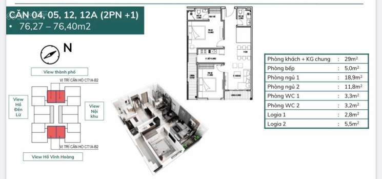 - Căn số 04, 05 DT 76m2, 2PN 2WC, cửa vào ĐN, ban công TB, view thành phố, giá 2,760 tỷ.