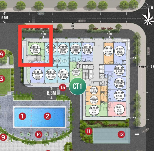 - Vị trí góc đường phía trước 5.5m, lề 3,5m và khoảng lùi tòa nhà thêm 3.5m rất rộng. Bên cạnh là cổng chào của cả dự án, gần hồ bơi.