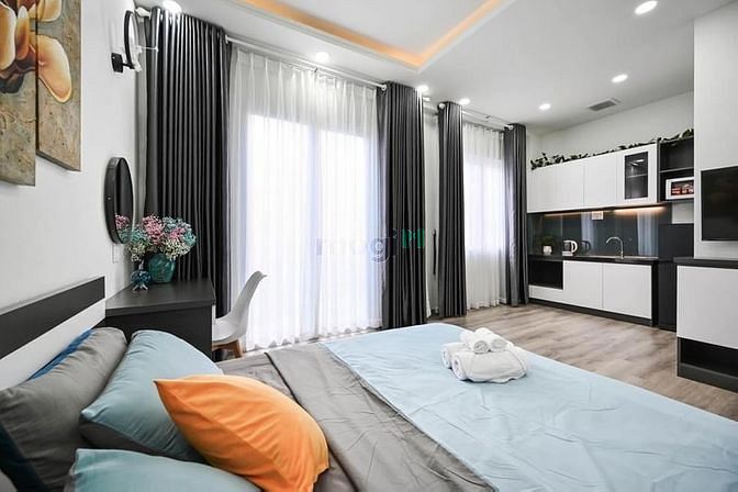 - Phòng trang bị đầy đủ nội thất: giường, nệm, tivi, tủ lạnh, máy lạnh, máy nóng lạnh, tủ quần áo, kệ bếp, bếp, bộ sofa...