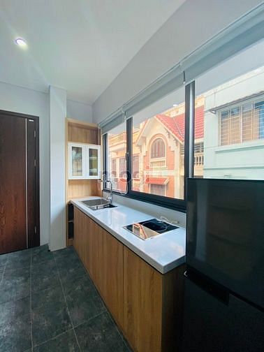- Khu bếp có bàn bếp, tủ bếp, bếp từ, tủ lạnh, hút mùi, đầy đủ ánh sáng, gió và không khí vào phòng.