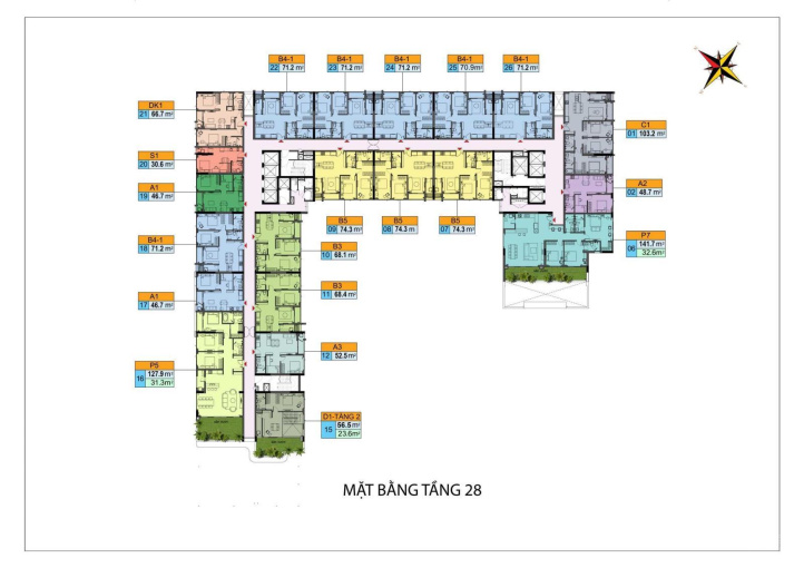 - Diện tích 68 - 71 - 74 m2.