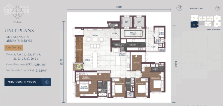 - Diện tích sàn 239m2, diện tích sử dụng 216m2. Bố trí căn hộ 4 phòng ngủ, bao gồm có 2 phòng ngủ master, 2 phòng ngủ thường, 02 khu vực hệ thống bếp riêng biệt là bếp khô và bếp nước, 1 phòng làm việc, 1 phòng cho người giúp việc và 1 kho chứa.