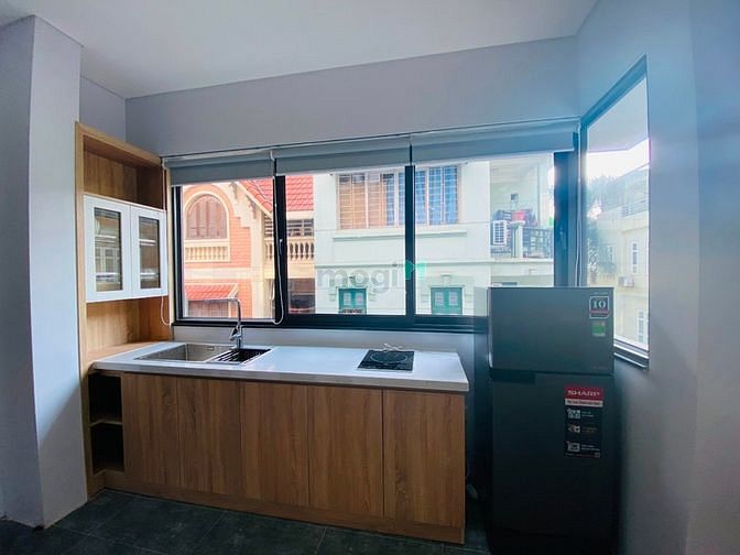 - Khu bếp có bàn bếp, tủ bếp, bếp từ, tủ lạnh, hút mùi, đầy đủ ánh sáng, gió và không khí vào phòng.