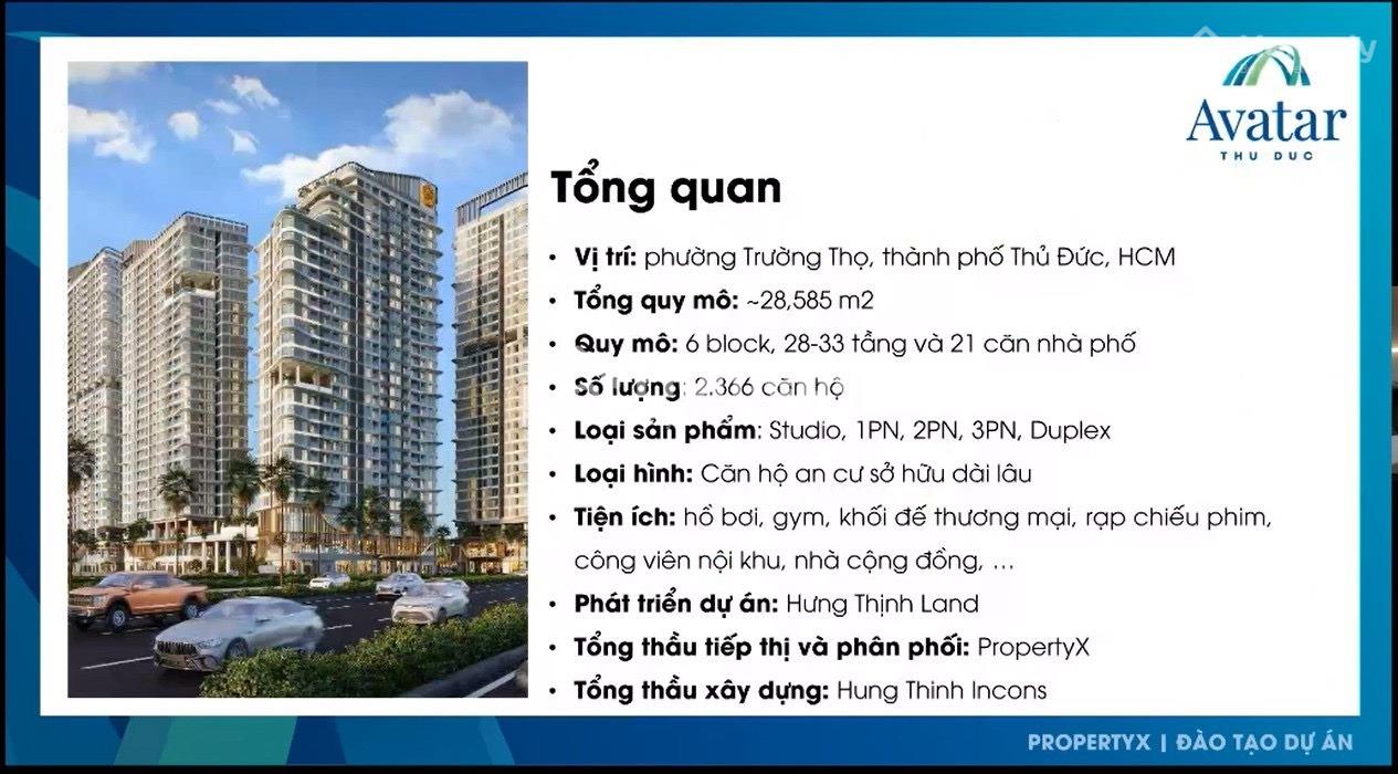 Khu Phức Hợp Avatar Thủ Đức. - Vị trí dự án căn hộ Avatar Thủ Đức: - Mặt tiền đường Vành Đai 2, Phường Trường Thọ, TP Thủ Đức. - Phát triển dự án: Hưng Thịnh Land. - Tổng Thầu Xây Dựng: Hưng Thịnh Incons. - Chủ Đầu Tư: Hưng Thịnh Corporation. - Đơn vị phân phối và tiếp thị: Property X. - Quy mô: 28.585m². - Gồm 5 block. - Số lượng căn hộ: 2.366căn. - Số tầng: 28 - 33 tầng. - Pháp lý: Sở hữu lâu dài. (có sổ hồng).