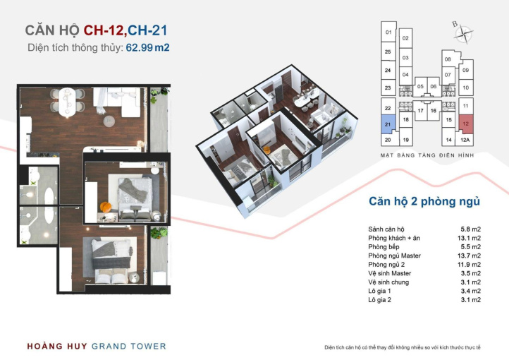 - Diện tích sử dụng: 62.99m2.