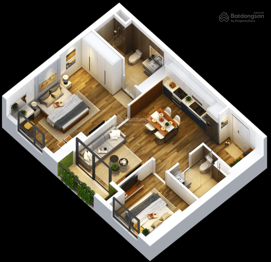 Diện tích 67m2 gồm 2 phòng ngủ, 2 vệ sinh, 2 ban công, 1 lô gia thoáng mát.