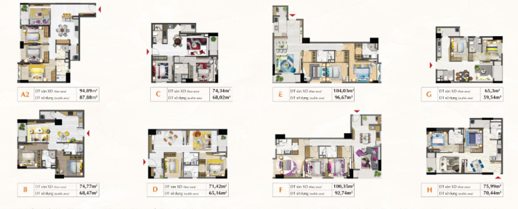 Căn 3 PN 83m2 đến 103m2 giá nội thất cơ bản từ 13tr/th đến 15tr/th.
