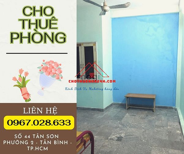 Diện tích: 60m2 Phòng`có ban công, cửa sổ thoáng mát, ánh sáng tự nhiên, nội thất cơ bản, WC riêng. Nội thất gồm: Tivi, Máy lạnh, Bàn ghế, Quạt trần, Rèm cửa,... Tiện ích xung quanh đầy đủ: Chợ, Trường Học, Ngân hàng,... Khu an ninh, yên tĩnh, dân trí cao. Giá thuê: 3 triệu/tháng (cọc 1 tháng) Free: Gởi xe Điện: 3.5k/kWh - Nước: 100k/người/tháng. Địa chỉ: số 44 Tân Sơn Hoà - Phường 12 - Tân Bình - TP.HCM. Liên hệ: 0967028633 Chị Dương