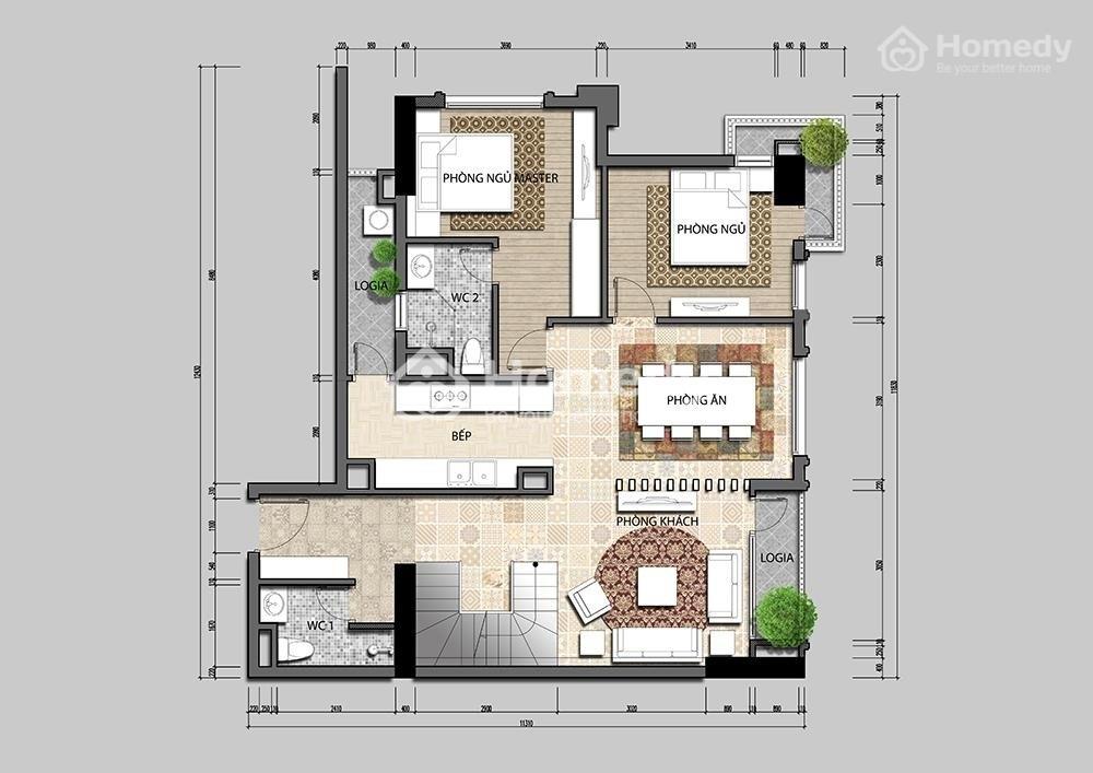 * Tầng 1: Có 2 phòng ngủ, 1 phòng khách, 1 phòng ăn + bếp, 2 WC, 3 logia.
