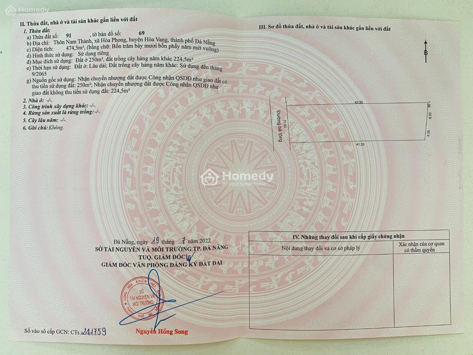 Đất Xã Hòa Phong, Hòa Vang, Đà Nẵng, 475m2 có 250m2 đất ở mua làm vườn, mua đầu tư rất đẹp