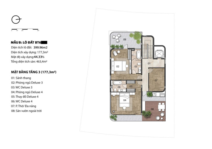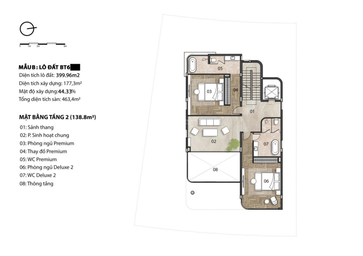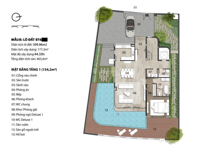 Gồm 3 tầng - 5 phòng ngủ - 6WC và không gian sân vườn hồ bơi siêu rộng.
