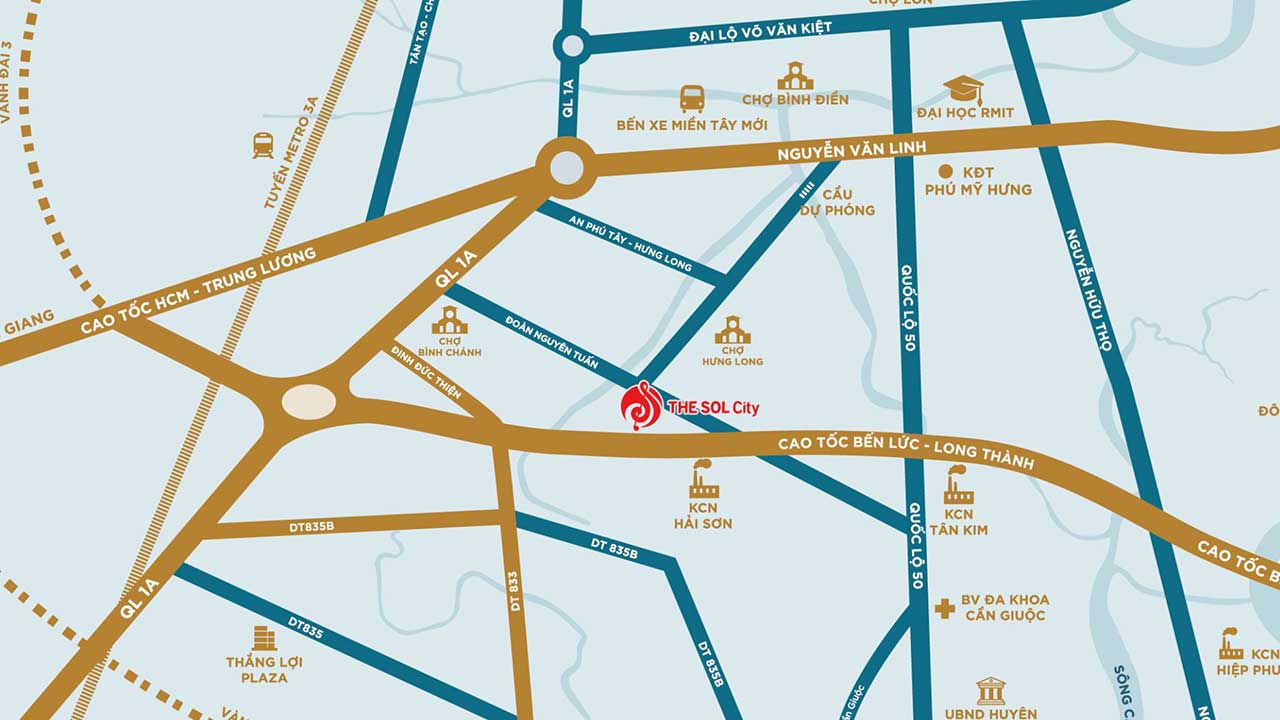 The Sol City nằm gần tuyến đường Đoàn Nguyễn Tuấn (Hương Lộ 11), thuộc địa giới hành chính Xã Long Thượng, Cần Giuộc, Long An. Một phần của dự án thuộc địa phận TP.HCM và giáp ranh với huyện Nhà Bè, liền kề khu Phú Mỹ Hưng (Quận 7).