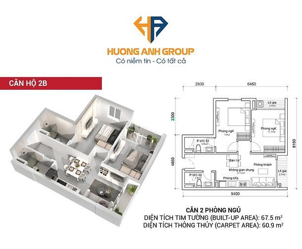 - Diện tích sử dụng 61m2 vuông vắn, phù hợp: phòng khách (21m2), phòng ngủ (11,7-13m2), ban công (2,5m2), lô gia (2,4m2),…