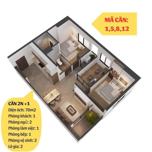 Diện tích 68 - 70m2 loại 2PN - 3PN.