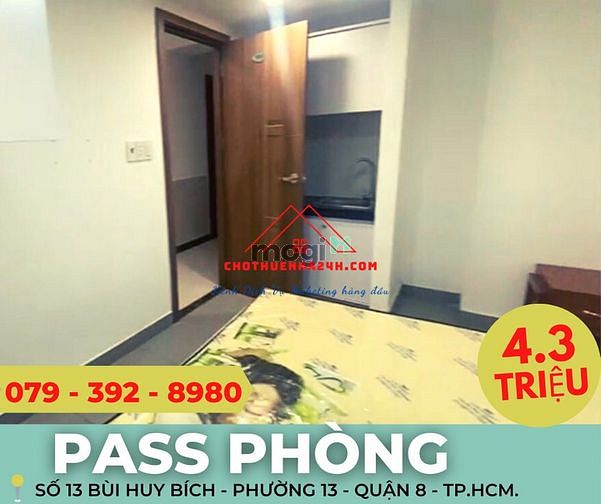 Pass Phòng vị trí: Số 13 Bùi Huy Bích - phường 13 - quận 8 - TP.HCM. - Diện tích: 16m2 - Phòng có nội thất cơ bản gồm: tủ, máy lạnh, máy nóng lạnh, máy giặt (2 Phòng xài chung). Giá Thuê: 4.3 triệu/tháng (cọc 1 tháng) - Điện: 3.8k/kWh - Nước: 100k/ người - Phí dịch vụ(rác + wifi): 100k, giữ xe 100k Liên hệ: 0793928980 Trọng Bình