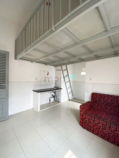 phòng có gác lửng, kệ bếp nấu ăn, bồn rửa, nhà vệ sinh riêng ,...