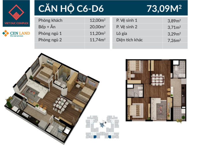 + Căn C1606 diện tích 74m view Đông Nam.
