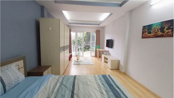 - Phòng ngủ tách riêng biệt bao gồm: giường nệm, tủ quần áo 3 cánh, bàn ghế sofa, tivi, máy lạnh, bàn làm việc.