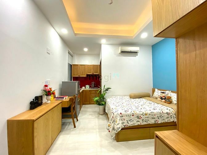 Diện tích 30m2. Phòng được trang bị đầy đủ nội thất: Giường nệm, tivi, tủ lạnh, máy lạnh, nóng lạnh, bàn trang điểm, bàn ghế làm việc, tủ quần áo, kệ bếp, tủ bếp, bếp điện từ,…