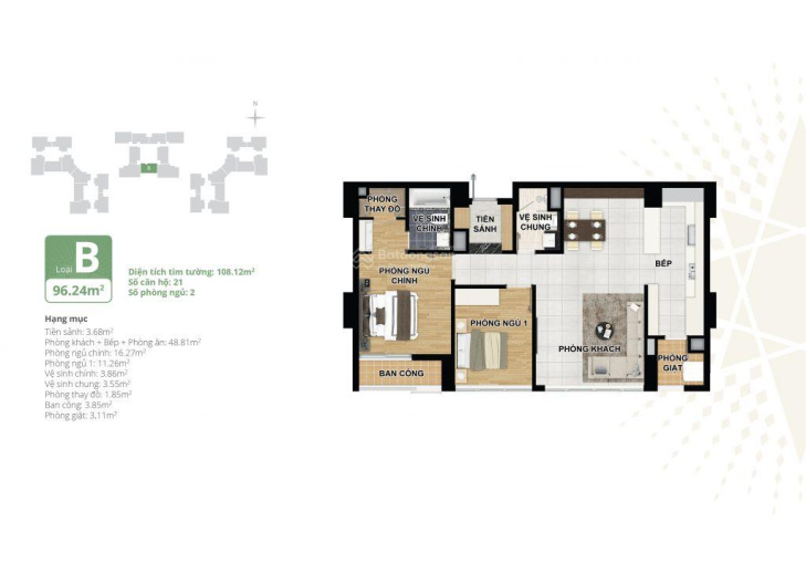 + Căn 2 phòng ngủ diện tích: 96m hướng Nam view tiện ích nội khu giá 6. X tỷ.